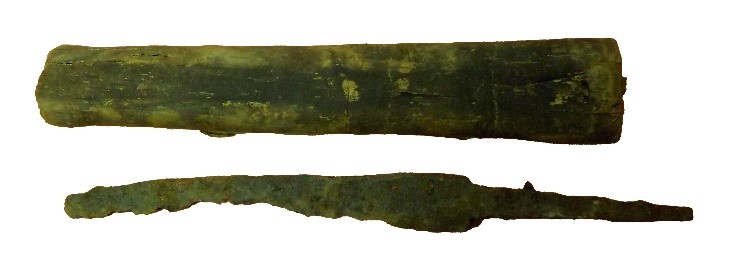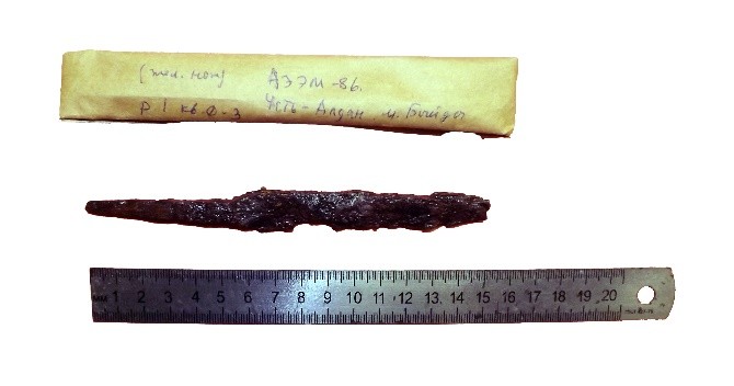 | 6 | Верхоянский район, Дулгалахский наслег, м. Бюгюйэх III, 2011 г. | м | у правого бедра | клинок цельнокованый, одноупорный, спинка прямая, сильно подвергся коррозии | 14 | 11 | XIX |