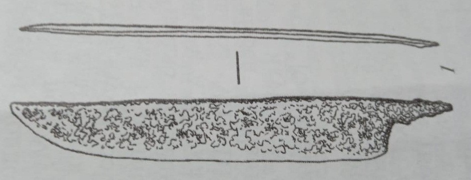 | 3 | Верхоянский район, Борулахский наслег, м. Кюереллех I, 2011 г. | м | у правого бедра | клинок лезвия с насадом, одноупорный, цельнокованый с прямым обушком | 12,5 | 11 | XVII |