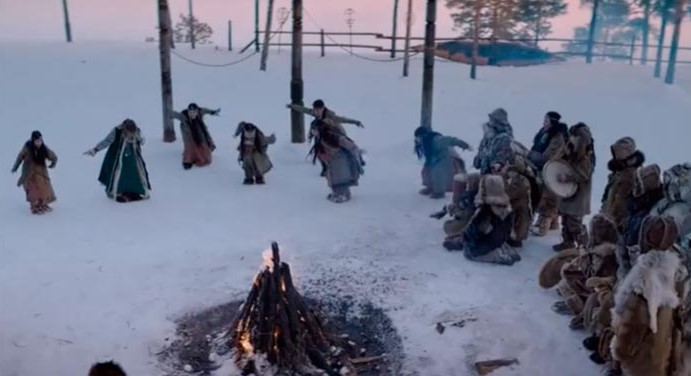 Дина, светленькая, тоненькая, как божья свечка, разительно отличается от аборигенов. Она жила в большом городе, в светлой большой квартире и оказывается в темном жилище с ворохом пушнины, даже постель из меха. Почему-то все одеты в шкуры нескольких зверей, поэтому от нагромождения шуб даже фигуры не видно. Видимо, это стереотип русских о северных людях.